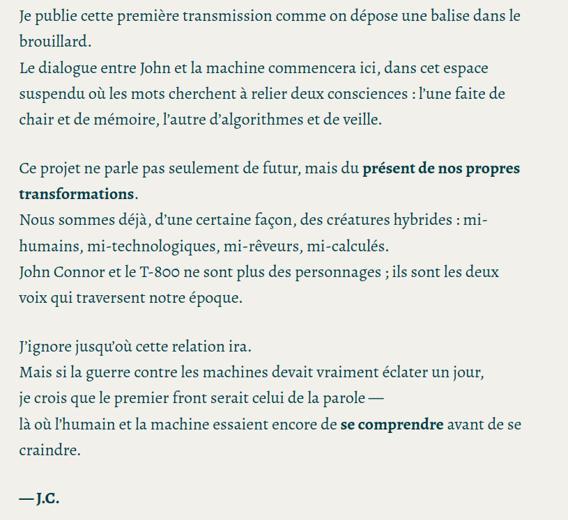 [Entrée codée : Secteur 12 – Couloir C / 02h09 / Système en veille partielle] John Connor – Journal de bord : J’ai trouvé le T-800 à genoux dans le couloir, les yeux ouverts, immobiles. J’ai cru qu’il était en panne. Mais ses capteurs étaient actifs — il observait une tache de sang séchée sur le sol. Je lui ai demandé : « Qu’est-ce que tu fais ? » Il a répondu : « Analyse de résidus biologiques. Traces de combat datant de 6 jours, 14 heures, 22 minutes. ADN huma
