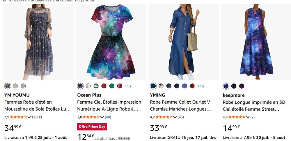 Les pas chères: n 6,(peu de tissu, tissu synthétique) et  8. (tissu de polyester -peut être recyclé-) et n 4 robe chemise en denim (qui est un tissu très commun.)