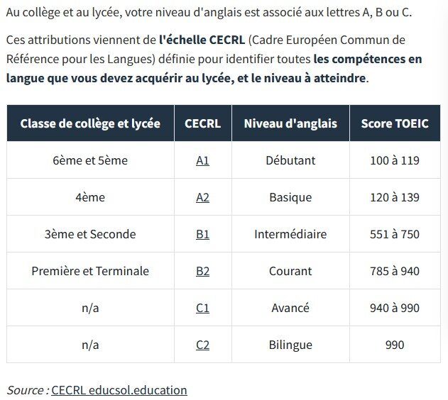 Le lien que je poste là dit juste en quelle classe on est censé avoir tel niveau de langue. Il ne s'agit pas d'anglais. En plus j'aime pas cette langue.