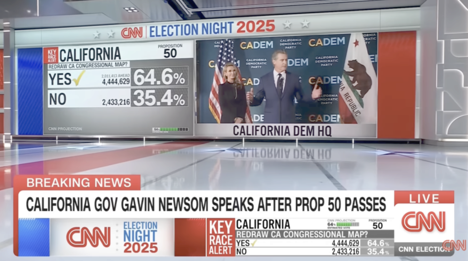 Pour mémoire, la Proposition 50, c'est exactement la même chose que le découpage de la carte électorale du Texas par Donald Trump dans le but d'être favorisé aux prochaines élections, sauf que celui-ci l'a ordonné de la façon autoritaire du fasciste qu'il est en réalité, tandis que Gavin Newsom a effectué le même découpage de la carte de Californie et dans le même but. c'est-à-dire d'être favorisé aux prochaines élections. mais en passant par le vote des Californiens.