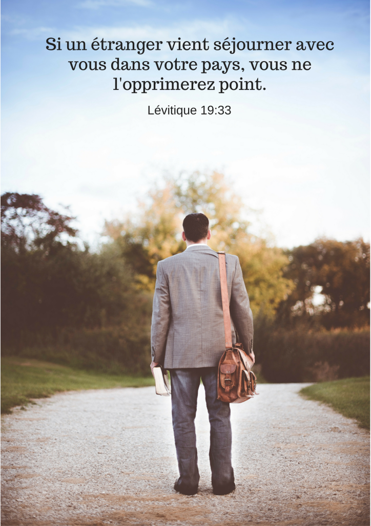 Si un étranger vient séjourner parmi vous, ou avec vous, dans votre pays : vous ne le molesterez pas, vous ne l’opprimerez pas, vous ne le maltraiterez pas. L’étranger qui séjourne parmi vous, sera pour vous comme l’un de vos compatriotes, comme l’ Israélite de naissance, et vous l’aimerez comme vous-mêmes (Lévitique 19/ 33-34)