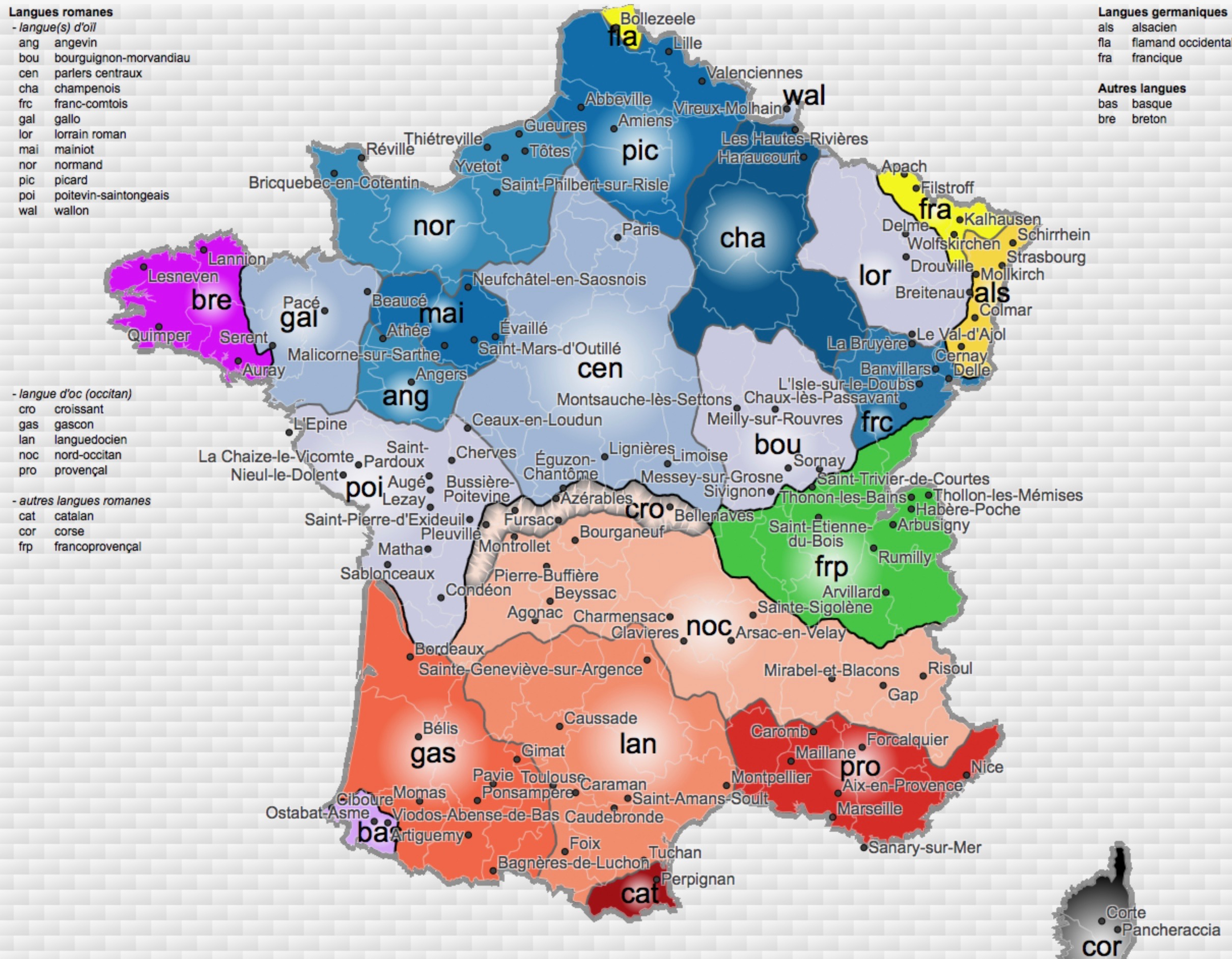 Une fable d'Ésope peut être écoutée et lue dans la langue régionale de votre lieu de vie (en cliquant sur un point de la carte le plus proche de votre commune). Sont incluses également sur d'autres cartes toutes les langues étrangères et variétés dialectales parlées dans l'hexagone, ainsi que les langues des territoires d'Outremer, etc.