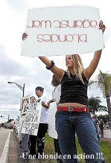 la blonde, elle milite contre la guerre, elle crois que ça va faire avancer les choses,