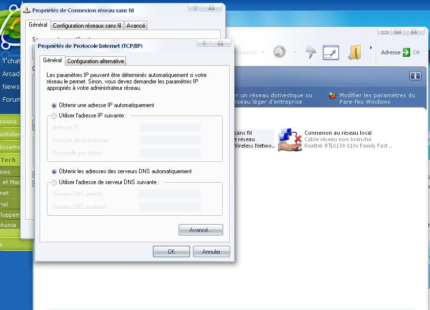Est-ce que ça ne pourrait pas être un problème de DNS ? Sous XP le plus simple est de cocher "Obtenir automatiquement", de même que pour l'ip (cf copie d'écran).