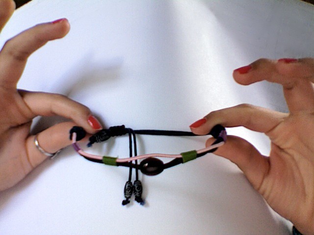 il a trois ficelle qui sont reliés et au milieu il y a une grosse perle marron avec 3 faces et sur chaque face un dessin. Le vendeur m'avait dit que :