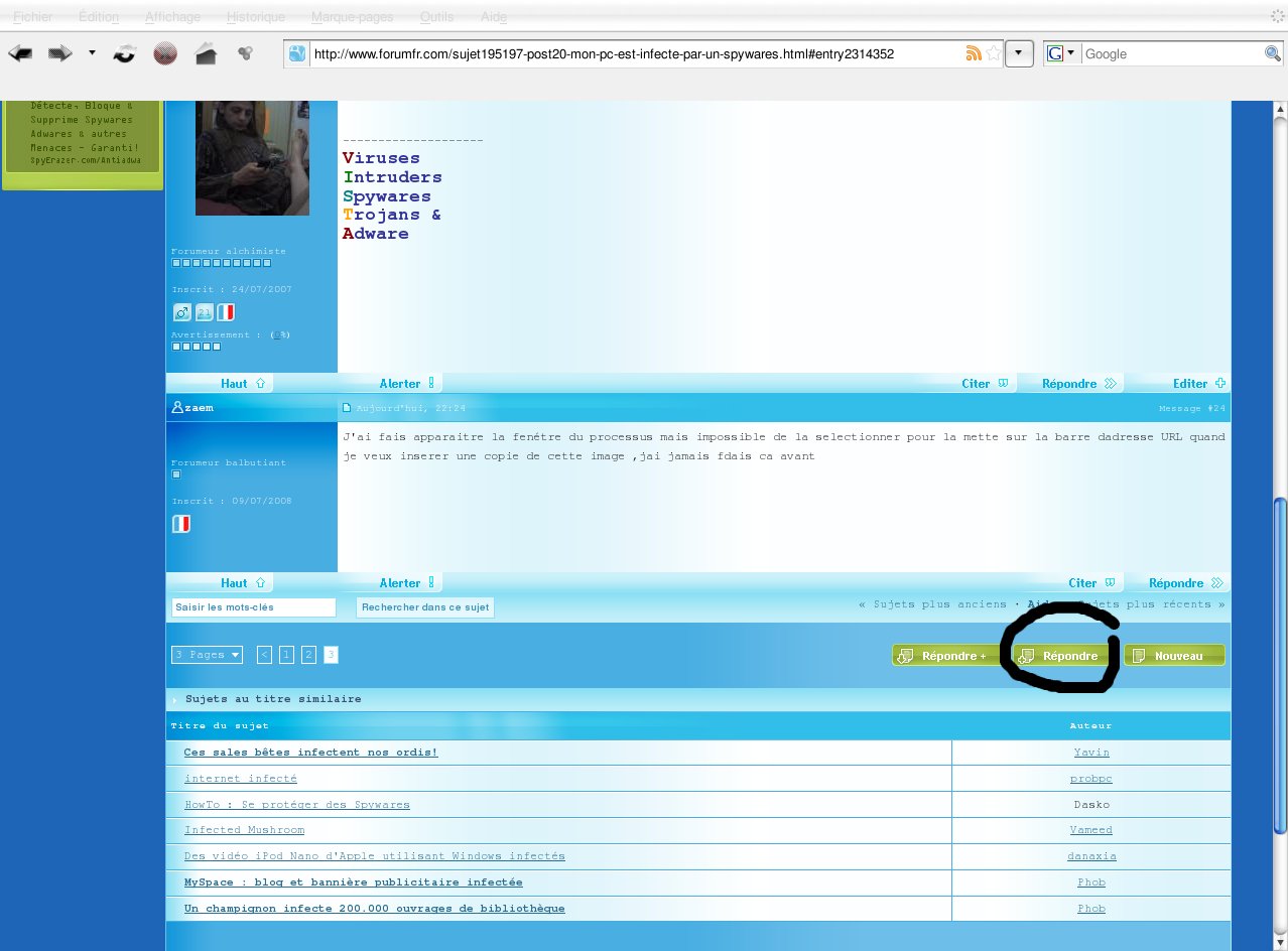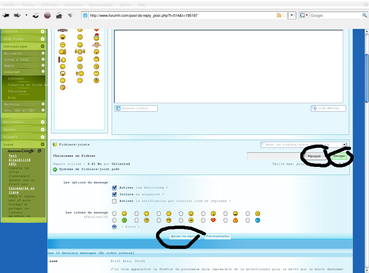 2/tu accederas donc, à la meme page que je te montre (images 2), tu appuies sur le bouton "parcourir..." (que je t'ai entouré), alors, à partir de là, tu cherche ta capture d'écran que tu veux me montrer, tu fais "ok" , ou "ouvrir" enfin, tu vois quoi, et, aprés le chargement, une fois que c'est revenu sur cette page de forum, tu appuies sur le bouton vert "envoyer" (que j'ai entouré), tu attends que ça charge (ce sera écrit "envoi du fichier en cours"), puis, tu appuies sur le bouton en bas, "ajouter ma réponse".