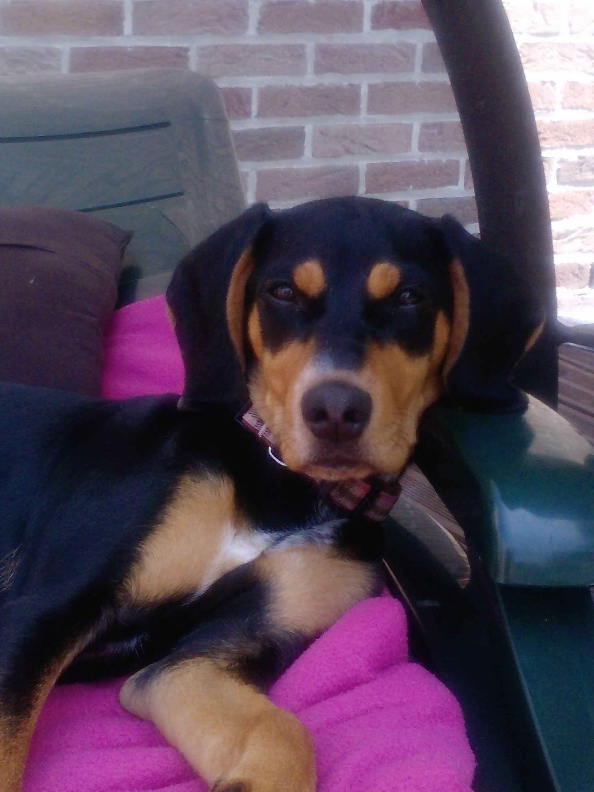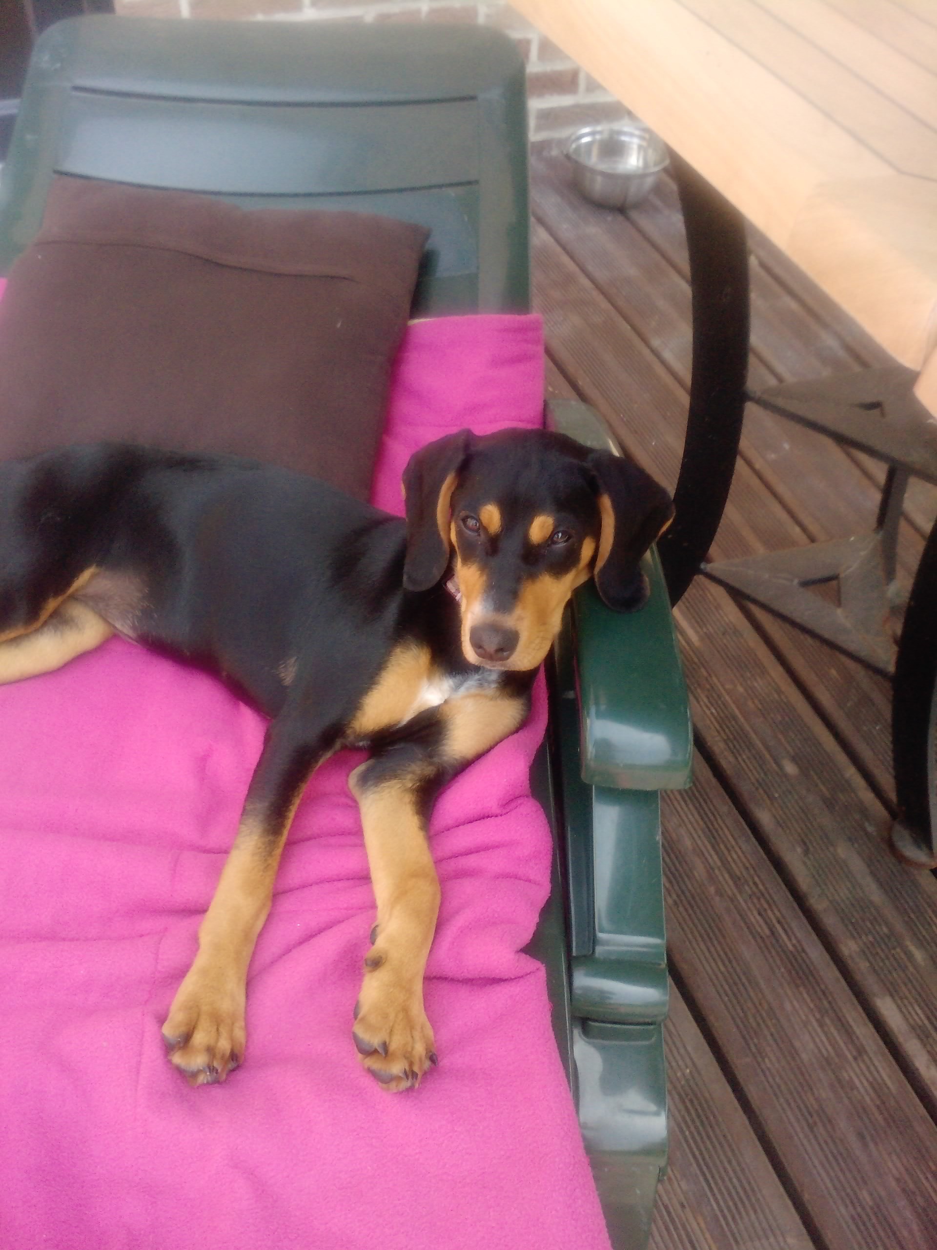 Bonjour voila j'ai adopté Luna sur la photo elle est a 5 mois et demi et pese ds les 10KG.elle est noir et feu avec un liseré blanc comme vous pouvez le constaté. Elle est tres belle mais j'aurais aimé savoir de quel race pouvait elle provenir? elle est tres joueuse et energique!! lol avec un sacré caractere ^^ sur son carnet de vaccination il dise que c'est un croisé chasse , peut etre avec un dogue allemand on ma dit aussi mais sa ne m'avance pas plus. elle a un tres beau poil lisse et bien brillant on m'a dit que sa pouvez etre un pur race car son pallé est un peu noir?! je ne sais pas du tout donc merci d'avance de vos reponses.