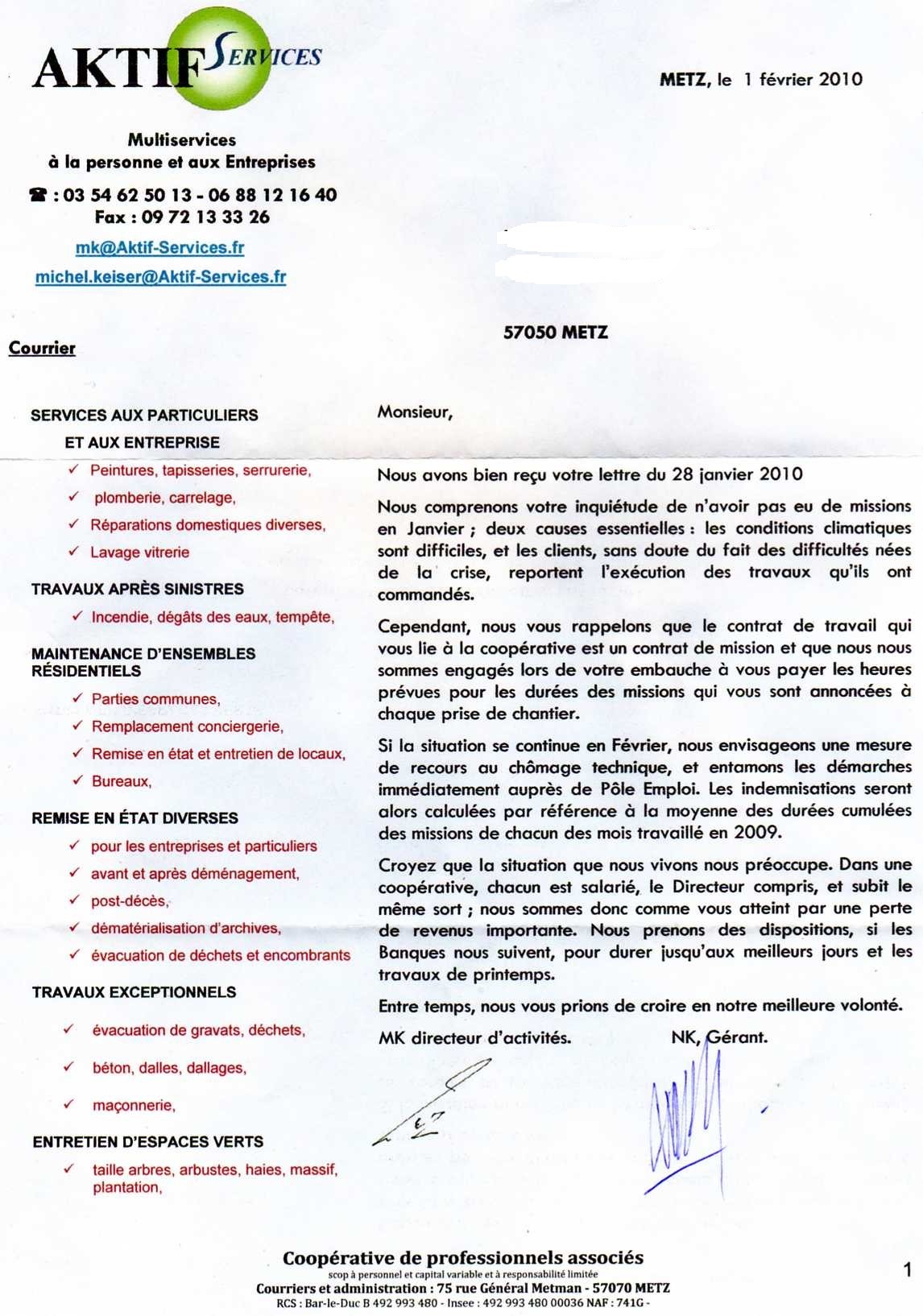 depuis le 01.01.2010 son entreprise a pas de travail et le patron refuse de le payer ! mon père a envoyer un lettre AR a son patron (je mais la lettre en page joint)
