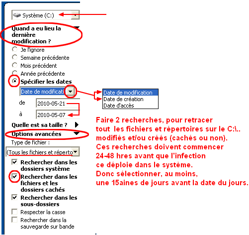 • Après l'utilisation du scanner. Vérifiez les "possible" traces restantes de l'infection, dans le système de fichier et le registre. Pour le système de fichier, utiliser la fonction Recherche(plus loin) du Menu Démarrer ou de l'Explorateur. Et pour le registre Hijackthis.