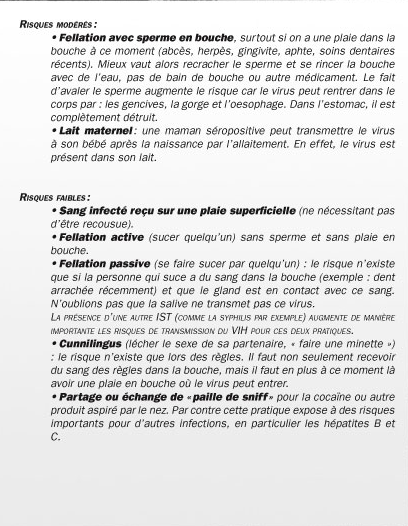 Bonjour je ne s'est pas si sa pourra être utile a quelqu'un mais j'ai souhaité partagé ces deux images car on ne s'est jamais. Dans mon cas il y avait plein de façons d'attraper le SIDA que je ne connaissais pas ! Je précise c'est tiré du manga réseau positif . post-127912-0-72464500-1304855263_thumb.png post-127912-0-72414700-1304855272_thumb.png