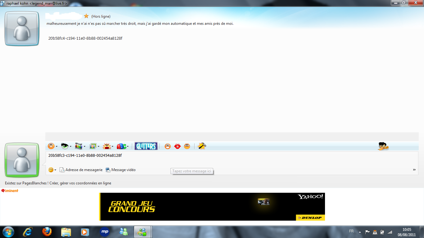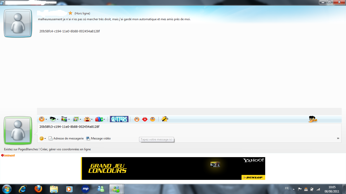 j'ai un petit soucis avec mon msn 2011 je l'ai télécharger il y a à peu près 6 mois tout marchait bien jusqu'à il y a quelques semaines, quand j'ouvre une fenetre de discussion pour parler a un ami ça m'affiche des chiffres et des lettres qui ne veulent rien dire : 7c198dde-c13d-11e0-8ce5-002454a8128f (en haut là où on lit les messages du correspondant et en bas là où on écrit) . j'ai demandé conseil a un informaticien qui m'a dit que ça pouvait etre un virus et qu'il fallait que je fasse une analyse complète de mon ordinateur et de nettoyer les virus si j'en avais c'est donc ce que j'ai fait mais ça n'a rien changer j'ai toujours les chiffres et les lettres qui s'affichent. si quelqu'un aurait une solution a ce probleme je le remercie d'avance et je vous en serais reconnaissante .