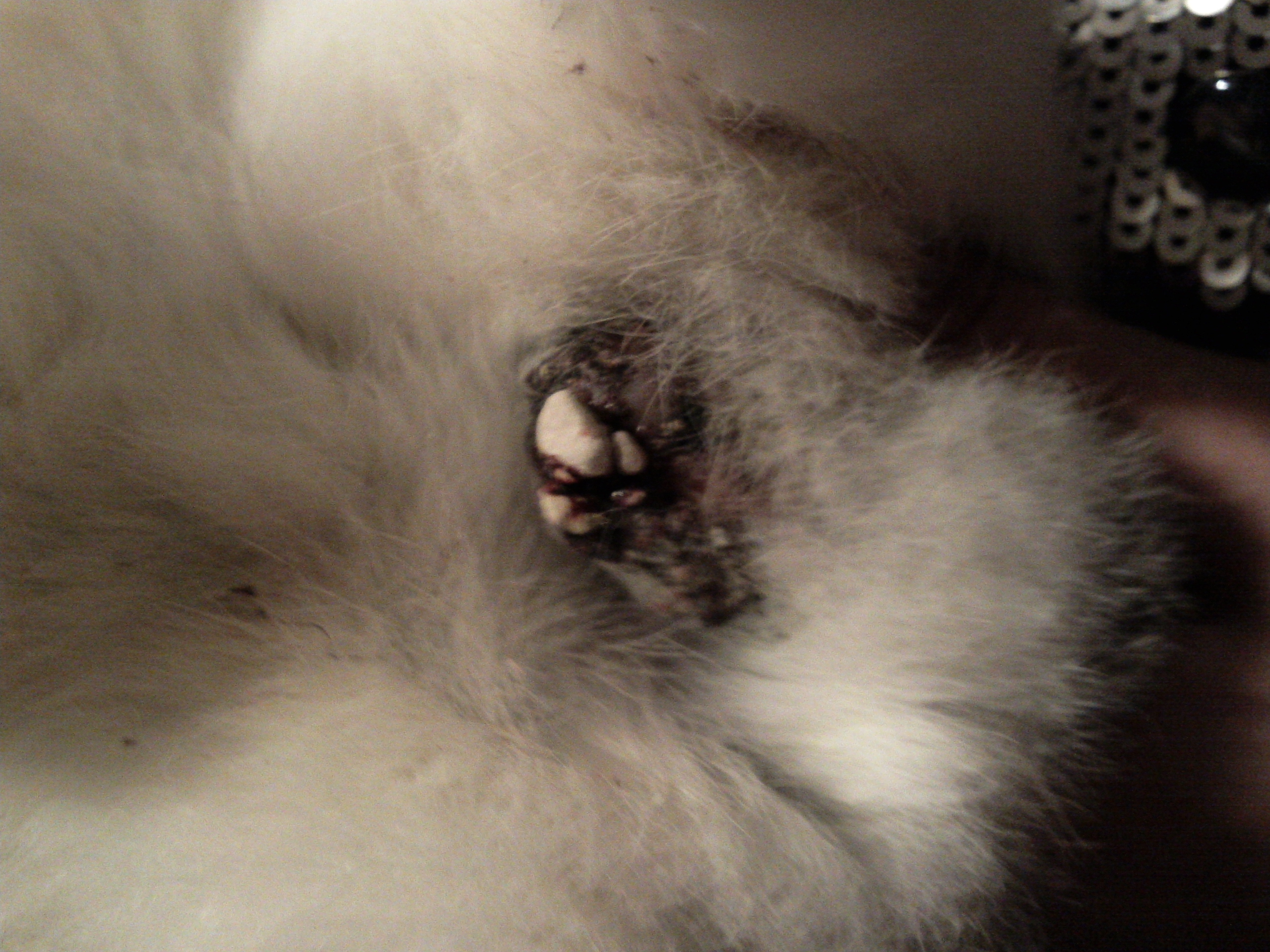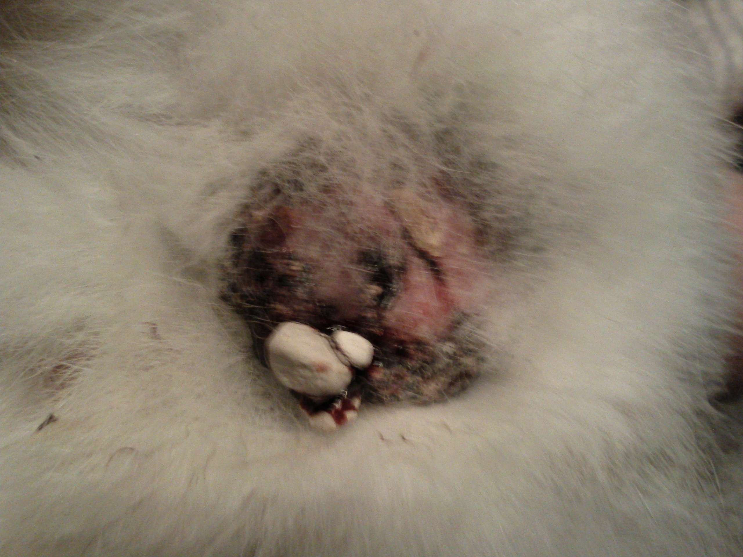 Bonjours, depuis quelque temps mon lapin (4ans) à une boule au niveau du derrière, celle ci ne diminue pas mais ne grossit pas non plus. Je croyais que c'était des saleté qui s'avait mis dans ses poils mais non...Sa vient de saigner et je ne sais pas se que je doit faire :/ Je pense que c'est une tumeur (j’espère pas ! ) Avez vous déjà eut cette boule sur votre lapin ? Comment la guérir ? Doit je aller chez le vétérinaire ? Merci à ceux qui me répondront. Je vous joint une photo (Un gravier de litiére reste collé sur le sang sécher :/ )post-151821-0-16335700-1321813384_thumb.jpgpost-151821-0-32252600-1321813265_thumb.jpg