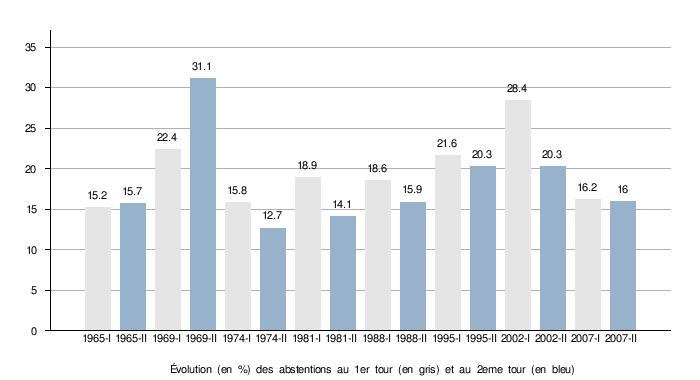 Si l’on met de côté l'élection de 1965 (abstention exceptionnellement forte, notamment au second tour où deux candidats de droite s’opposent) et celle de 2007 (abstention exceptionnellement faible), c’est même une hausse très régulière de l’abstention qu’on observe.