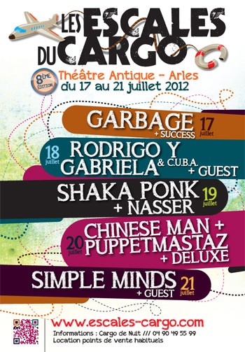 Pour ce nouveau cru 2012, l’équipe du Cargo (Scène de Musiques Actuelles à Arles) a encore frappé fort avec une programmation éclectique, internationale et surprenante ! 5 soirées – 5 styles musicaux différents dans un théâtre antique toujours aussi magique. La semaine débutera avec le retour très attendu de Garbage et son rock new wave (seulement 4 concerts en France cet été). Puis une ambiance latino avec le nouveau projet des deux virtuoses de la guitare Rodrigo y Gabriela accompagnés de l’orchestre C.U.B.A. Viendra ensuite le groupe le plus médiatisé du moment, Shaka Ponk et leur électro rock survolté ! Le hip hop jazzy aura une très belle place dans cette édition avec la crème du genre : Chinese Man et Puppetmastaz. Une édition qui se terminera par un soupçon de nostalgie avec Simple Minds et leurs plus grands tubes.