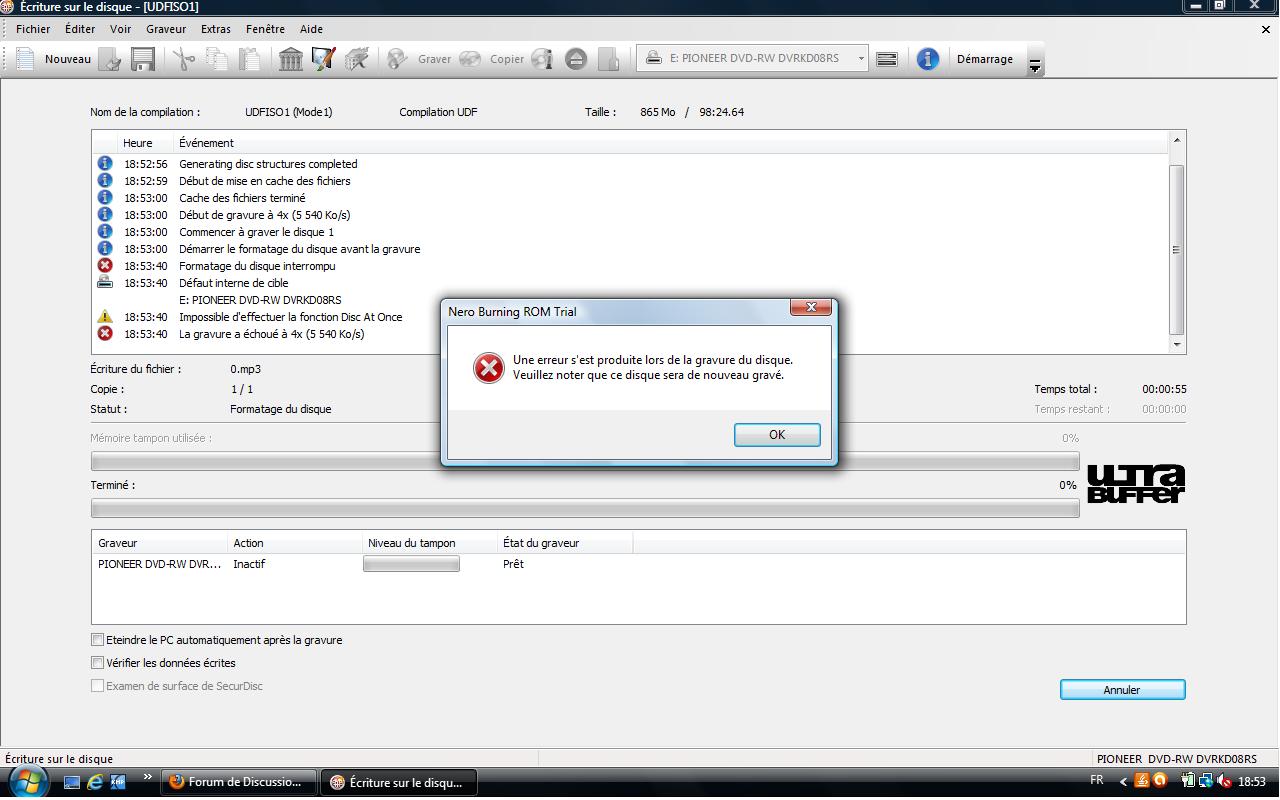 Bonjour, je n'arrive pas a graver un dvd avec nero 11 à chaque il m'écrit cela : (voir l'image)