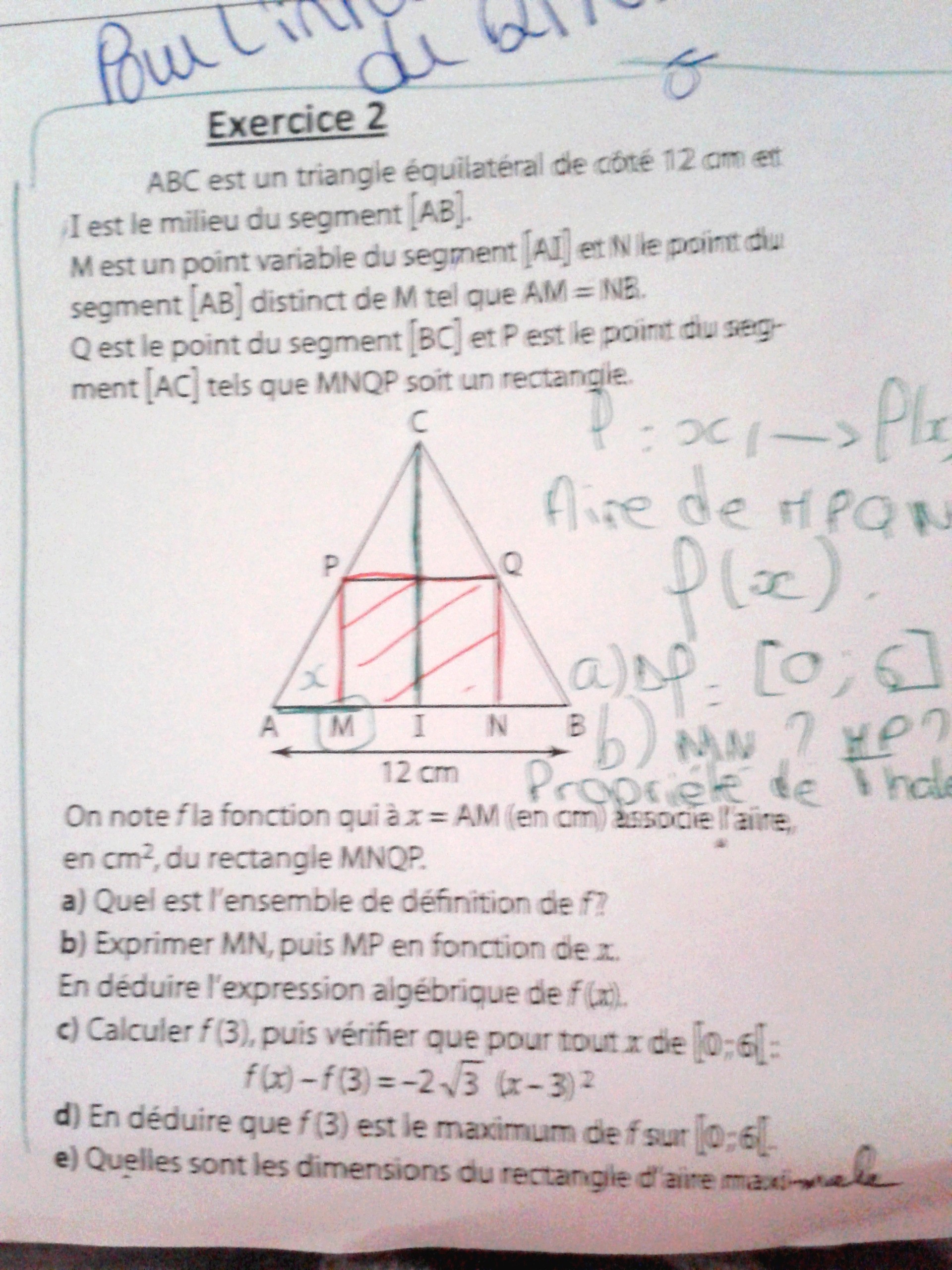 Pour la question b), Tu sais que MN=2MI=... Puis avec un peu de trigo classique, tu sais que tan(pi/3)=PM/x