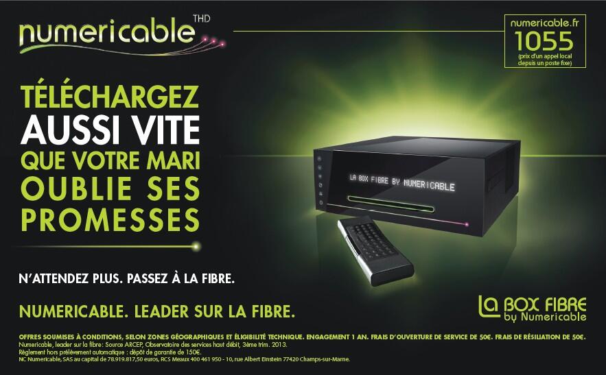 Numericable démarre mal l’année 2014 avec un gros bad buzz depuis la diffusion de sa nouvelle campagne de pub jugée sexiste. Sur cette affiche, on peut lire « Téléchargez aussi vite que votre femme change d’avis », un slogan pour promouvoir la puissance de la fibre de l’opérateur.