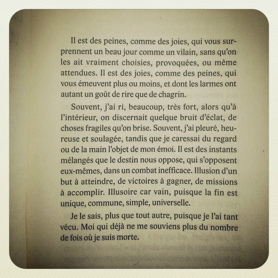 « J’ai chéri passionnément tous ces instants de bonheur pur, cet esprit de liberté, d’indépendance. Je voulais conserver précieusement ce grain de folie qui pétillait dans ma tête comme un rempart à la masse compressée des cerveaux noyés par des idéaux de réussite sociale, de bienséance, de propos convenus, de mariage parfait, d’enfant bien élevés. Je pensais pouvoir contourner le droit chemin sur lequel on tenait tant à me voir marcher, balancer d’un coup de pied les belles pompes cirées propre en ordre qu’on essayait de me faire chausser. Mais il y a toujours quelque chose ou quelqu’un pour vous forcer à les enfiler.