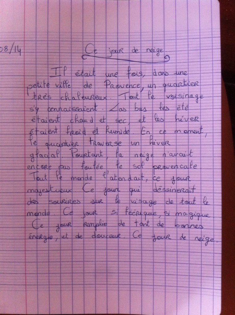 "Il était une fois, dans une petite ville de Provence, un quartier très chaleureux où tous se connaissaient. Les étés y étaient chauds et secs et les hivers froids et humides. Le quartier traversait alors un hiver glacial. La neige n'avait pas encore foulé le sol provençal mais tous attendaient ce jour majestueux qui dessinerait un sourire sur chaque visage. Un jour féérique et magique qui serait rempli de bonnes énergies et de douceur. Un jour de neige."