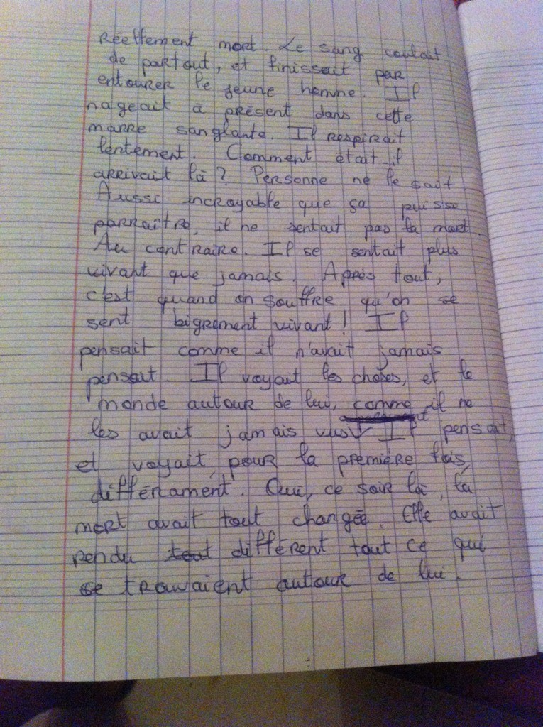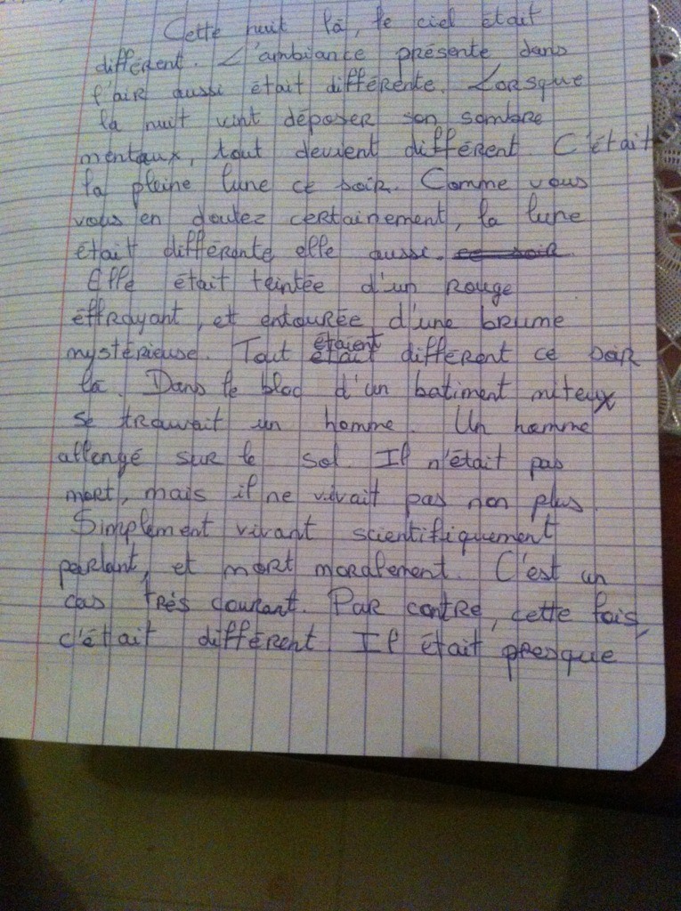 Par contre, paludatus, je trouve que le style "à l'oral" donne un certain charme à la lecture du texte. C'est un avis personnel après. Tu es au collège ? Ne t'inquiète pas, tu as encore le temps de t'améliorer au niveau de l'orthographe, ça viendra !