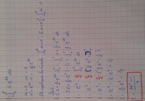 Le résultat final est juste mais quand tu intègres e^{2t}, tu obtiens (1/2)e^{2t} et non pas (1/2)e^4
