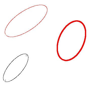 Voici par exemple 3 ellipses inclinées comme on veut : (on remarquera que l'une d'elles a ses foyers indiqués. C'est une option)