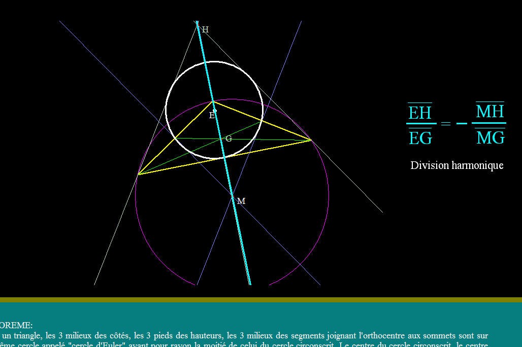 - Tracé de la droite d'Euler avec emplacement des points remarquables alignés sur cette droite et qui forment une division harmonique.