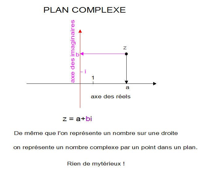 Tant mieux si ce petit texte vous a été utile, mais mon intention n'était pas du tout un cours mais seulement une tentative de démystification de l'expression : nombre complexe appelé aussi nombre imaginaire en montrant que ces nombres peuvent être situés dans un plan tout comme les nombres habituels peuvent être placés sur une droite.