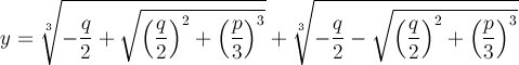 Voici la formule de Cardan avec ses racines carrées qui peuvent donc abriter des nombres négatifs bien que l'équation du 3ème degré ait une ou trois solutions, éventuellement une double dans le domaine des nombres réels, car, selon le théorème fondamental de l'algèbre dû à d'Alembert, toute équation algébrique de degré n admet n solutions, réelles, imaginaires ou multiples.