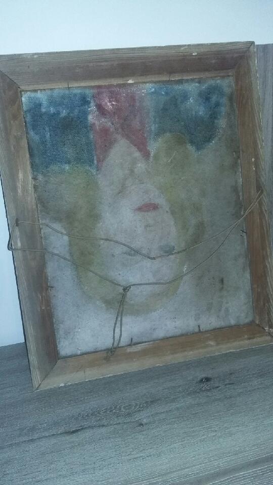 bonjours a tous voila jai cette peinture un autoportrait je penses peinture a huile signets me je ne connais pas cette signatures et je navais pas vue derrier aussi il ya un portrait de peints aussi le tableaux et cloutee sur les photo il ya le devant et arrieres merci beaucoup a tous pour vos reponses