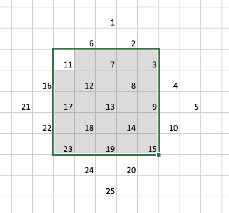 Pour l'ordre 5, on va avoir 25 nombres. On les dispose comme sur la figure jointe. On trace le carré central centré sur ce tableau.