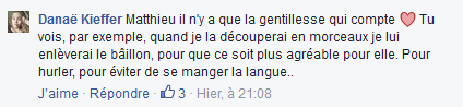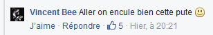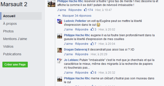 Il n'est donc pas très étonnant que Marsault ait également des méthodes d'extrême-droite: furieux de la fermeture de sa page Facebook, le dessinateur a lancé un appel à harceler une militante féministe qui saluait la fermeture de cette page. Le résultat: des insultes, des menaces de viol, de tabassage et de meurtre adressées par centaines à la militante en question, à ses amis, à sa famille, la diffusion de ses photos et de son identité un peu partout sur des pages fascistes. En voici quelques exemples ci-dessous: reproduire ces immondices pourra choquer, mais il est nécessaire que chacun sache de quoi on parle lorsqu'on évoque une campagne de haine fasciste parmi d'autres. marsault.PNG