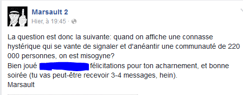 Bref, Marsault qu'il l'assume ou pas est banalement d'extrême-droite. Et de manière très banale dans ce pays, il a énormément de soutiens, beaucoup de succès et peu d'ennuis. L'homme qui passe sa vie à fantasmer le tabassage de ses ennemiEs féministEs et antiracisTes pleure sur l'horrible blessure infligée par la fermeture de sa page Facebook mais a déjà plus de 60 000 fans sur sa page de secours. L'homme qui se croit très courageux lance sa meute sur une militante, puis vient dire qu'il n'est pas responsable si la meute mord un peu trop fort.