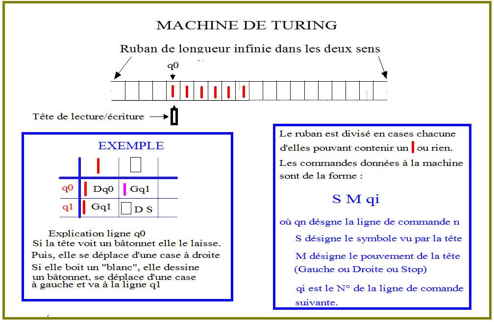 Mais Alan Turing est allé beaucoup plus loin et est vraiment considéré comme le père des ordinateurs. En effet il a démontré qu'il est possible de coder le "programme" de sa machine sur le ruban lui-même. C'est bien ce qui existe sur les ordinateurs dont la mémoire contient aussi bien le programme que les données.