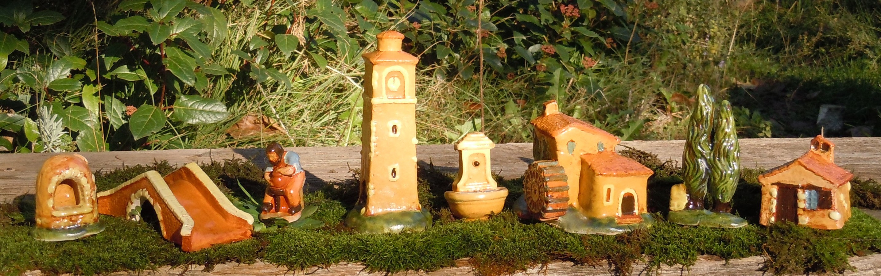 Le seul santon : le potier ! Parce que ça m'énervait de voir les potiers des santonniers, debout, figés, raides comme des piquets. J'ai voulu faire un potier avec les vrais gestes d'un potier. Y'a la tour de l'horloge, la fontaine, le puits couvert comme dans la pleine des Plans Et puis, les deux cyprès, qui en vrai sont en face sur la colline, je les ai fait façon Van Gogh avec les feuillages en forme de flammes... Y'a aussi le pont "romain" de la poste, le moulin qui est à 40 mètres derrière l'atelier et une fontaine murale qui se retrouve un peu partout mais pas adossée à un mur !