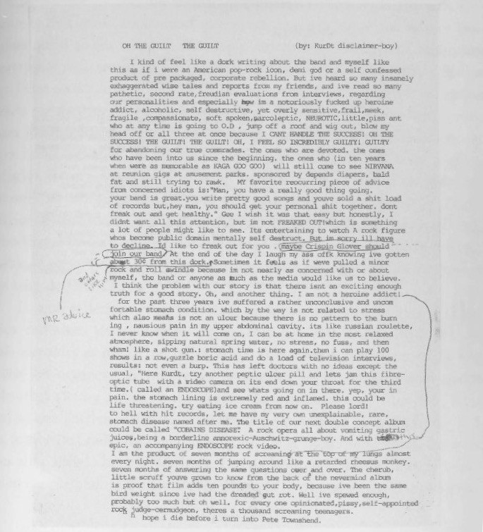 Je me sens un peu crétin à écrire comme ça sur le groupe et moi-même comme si j’étais une icône américaine pop-rock, un demi-dieu ou le produit autoproclamé de la rébellion packagée par le business. Mais mes amis m’ont rapporté tellement d’histoires insensées et de rumeurs débiles circulant sur mon compte, et j’ai lu dans mes interviews tant d’analyses freudiennes pathétiques et nulles de mon enfance jusqu’au stade actuel de ma personnalité, et comment je suis un héroïnomane notoire, foutu, alcoolique, autodestructeur, mais tellement sensible, frêle, fragile, doux, narcoleptique, névrosé, un minable prêt à overdoser à chaque minute, péter les plombs et se jeter d’un toit, me faire sauter le caisson ou ces trois trucs d’un seul coup. Eeeeh oui, DIEUU, je n’arrive pas à gérer le succès ! Le succès ! Et je me sens si incroyablement coupable ! D’avoir abandonné mes vrais compagnons, ceux qui croient en nous depuis des années […]