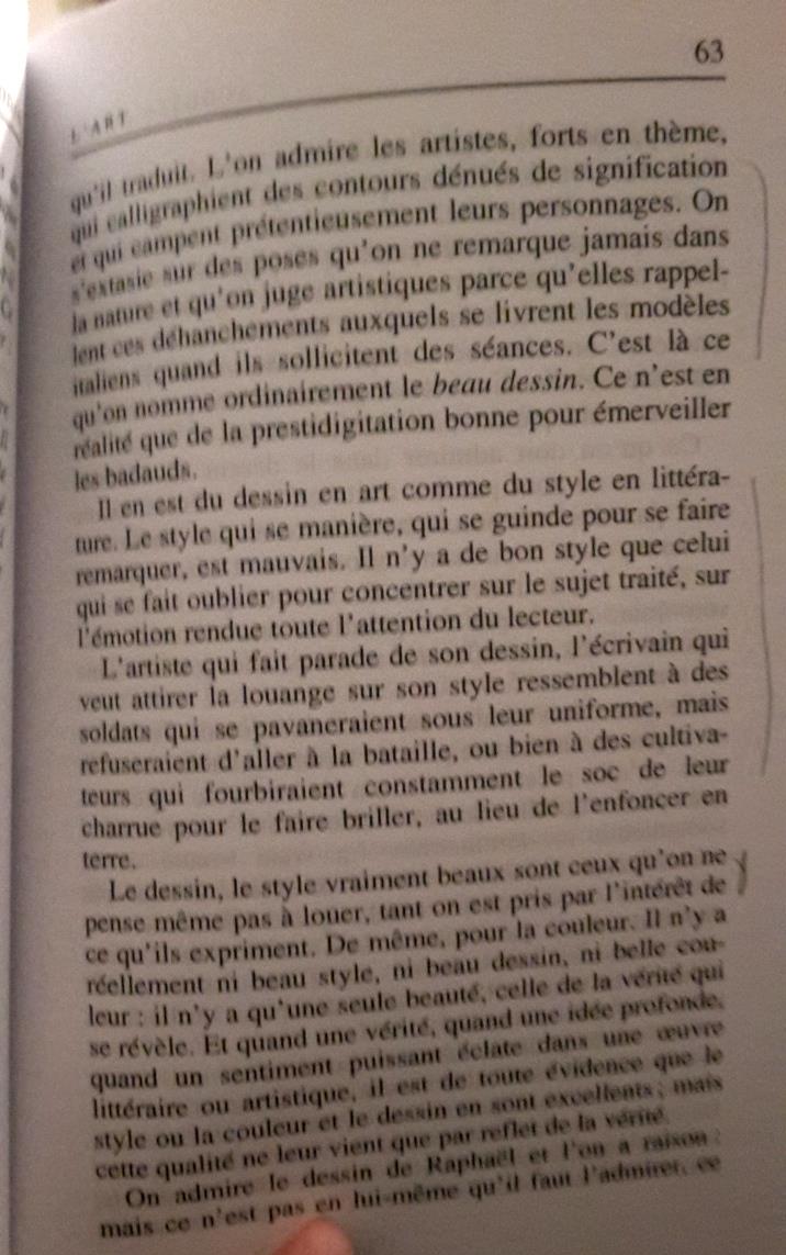 C'est intéressant, ça me redonnerait presque confiance en l'art lui-même. Mais si je comprends bien le premier passage, faut-il en conclure que l'artiste devrait chercher à imiter la nature? L'art ne pourrait-il pas être, comme il l'a souvent été, dans une forme de concurrence ou de pieds de nez à Dieu dans son pouvoir de création, c'est à dire que l'oeuvre devient une création qui vient concurrencer la création naturelle?