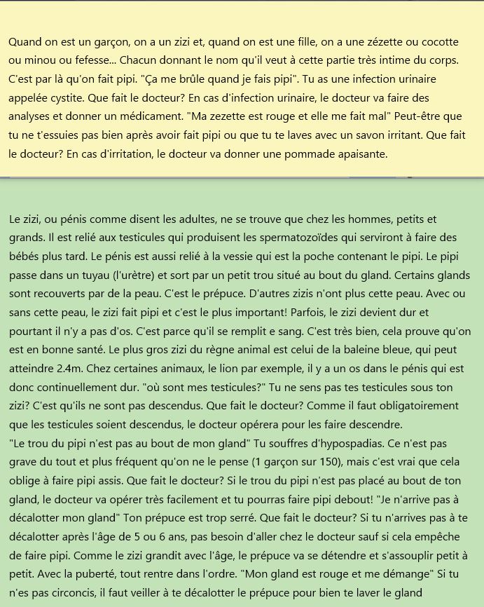 Puis tu dis que le livre se base que sur l hygiène, hors tu as tort puisqu'il parle de "zizi qui devient dur" (erection donc) et des testicules qui servent à faire des spermatozoides qui servent à faire les bébés...On n'est plus dans l'hygiène là....