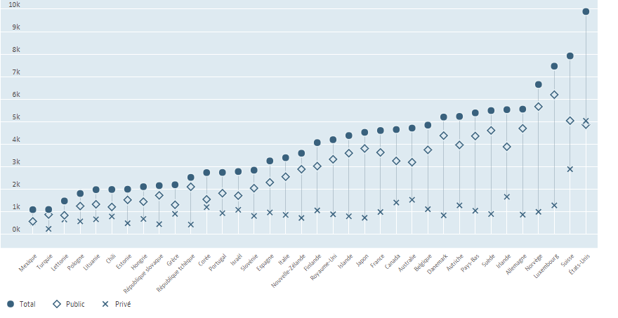 Coût santé aux USA par habitant: 10 000 $ (aucun équivalent; le plus élevé dans le monde; second le plus cher Suisse 8 000$ ) avec 50% payé par le publique et 50% de privé.