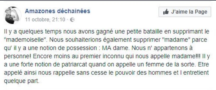 Supprimons aussi le mot "MAdame" , cet insupportable possessif nous rappelle sans cesse le pouvoir des hommes. Nous ne leur appartenons pas ! :mef: