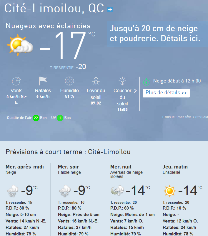 Hé oui, ça peut descendre assez fréquemment à -30 et -40 avec l'indice de "ressenti". Je surveille la météo pour sortir faire mon épicerie, c'est presque comme la vieille blague au sujet d'un esquimau qui attend sa "blonde", qui regarde le thermomètre et qui dit "à moins vingt, je m'en vais"...