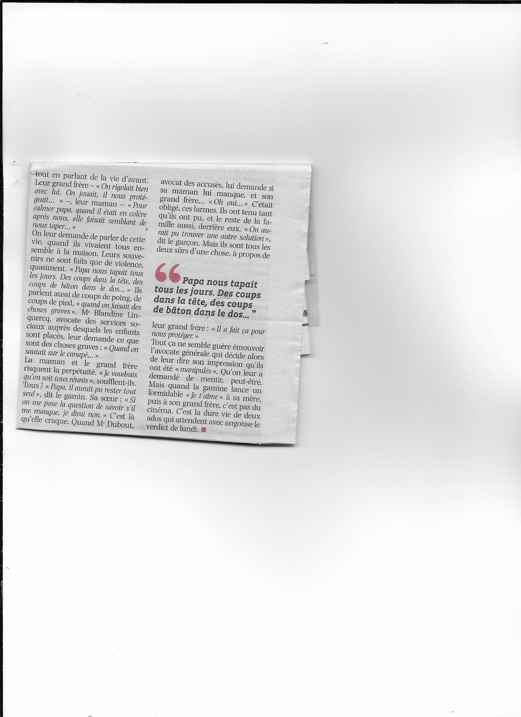 Je déplore comme je l'ai déjà dit que les auditions contradictoires ne soient pas relayées. Malheureusement, on connaît la presse des faits divers. Et comme on la connaît d'ailleurs, ici personne ne se prononce sur quoi que ce soit.