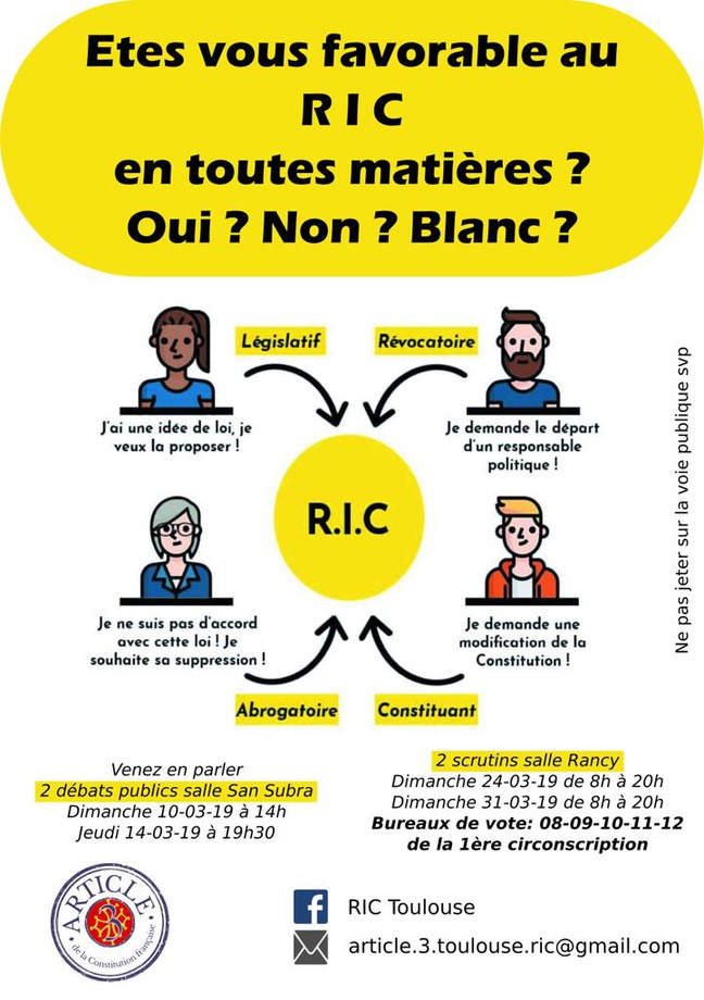 L’association “Article 3” organise un scrutin sur le référendum d’initiative citoyenne (RIC) - Recherchons des volontaires - https://t.co/ptyjQCXOZg #GJ #GiletsJaunes #GiletsJaune #GiletJaune #GiletJaunes #RIC Organisation du scrutin sur les dates du 24/03 et 31/03