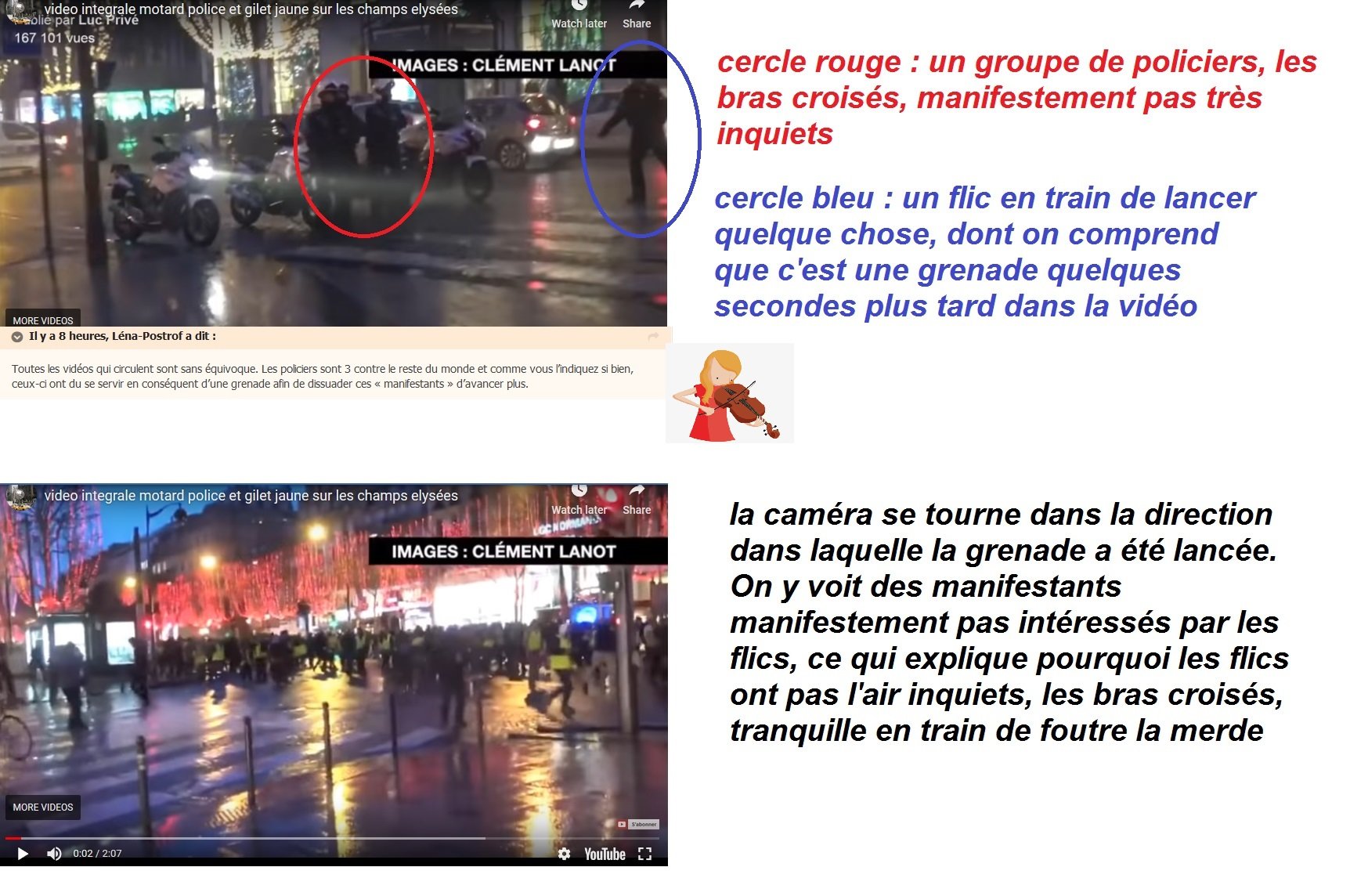 Ainsi, et à cet instant, il serait de bon ton de signaler objectivement qu'il n'existe QUE les images de Clément Lanot qui filme les policiers en train de jeter des grenades en direction de la foule et un grand vide visuel concernant ce qui se passse quelques secondes auparavant. De ce fait, et en dehors des événements que j'ai précédemment cité, rien de rationnel (filmé) ne permet de valider "vos splendides supputations" qui voudrait, comme vos images fixes le laissent supposer, que 4 fonctionnaires auraient, avec la plus maligne des gratuités, balancés plusieurs grenades histoire de faire un "carton" sur de "pauvres" gilets jaunes. Vous ne disposez que de vos interprétations de pequin de base que je devine politiquement très engagées et donc bien loin d'être motivées par une recherche impartiale de la vérité. Votre besace est vide. Point barre  !