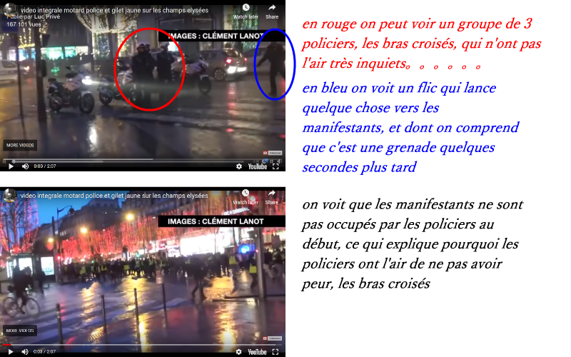 Vos images fixes (partiales... Voire très partiales) , et comme beaucoup d'internautes, sur la toile, l'ont fait remarquer, ne pourraient être considérées comme le VÉRITABLE début du déchaînement de violence qui va suivre à l'encontre de ces policiers. En effet, deux minutes (Source : Stéphanie Roy, journaliste, auteure de la vidéo "Motards vs Casseurs) avant que les fonctionnaires motards jettent quelques grenades en direction d'un fragment de la foule, certains de ses membres, déchaînés, ont poursuivis une colonne de vehicules de CRS qui descendait cette même avenue, en amont, en direction du croisement (George V-Champs Elysees) , s'en prenant violemment aux véhicules de la Compagnie de Sécurité Républicaine, jetant toute sorte d'objets et vociferant à leur encontre ("Faut les niquer ces fils de pute, faut les niquer ces batards... ! "(Video disponible Twitter)). (Clément Lanot, d'ailleurs, un autre journaliste, se situant à une centaine de mètres, filme cette colonne de vehicules de CRS faire demi-tour sur les Champs face à l'arrivée massive de Gilets Jaunes arrivant depuis le haut des Champs Elysees) . Les CRS, poursuivis, descendant l'avenue, donc, et depuis leur véhicule, ont jeté des grenades lacrymogène et de desencerclement en direction des poursuivants. Ces derniers sont ralentis tout en continuant de descendre l'avenue des Champs. La caméra de Stephanie Roy se coupe. Deux minutes plus tard, environ (Appréciation de Stéphanie Roy) la journaliste remarque la présence de 4 motards de la Police à l'angle de George V et des C.E (présence numérique qu'elle juge ridicule, à juste titre ! ) barrant l'accès de l'avenue G5 à la foule. Elle indique, à cet instant, que l'ambiance, due aux événements précédents est très tres tendue et qu'il n'y a pas que des "gilets jaunes" mais aussi des individus cagoulés, vêtus de noir au sein de la foule dont elle est en contact. Interviennent, alors, les images de Lanot et les événements des policiers attaqués de toute part, échappant de peu au lynchage.