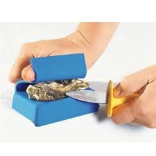Moi, je mets carrément la main qui enserre l'huitre dans une manique. Et j'y vais mollo avec le couteau quand je cherche la partie fragile de la coquille et tant que je n'ai pas scié le nerf du coquillage. Puis dès que le nerf cède j'imprime un mouvement de rotation vers la droite afin de dévier la pointe du couteau de ma main gauche.  C'est tout un art.