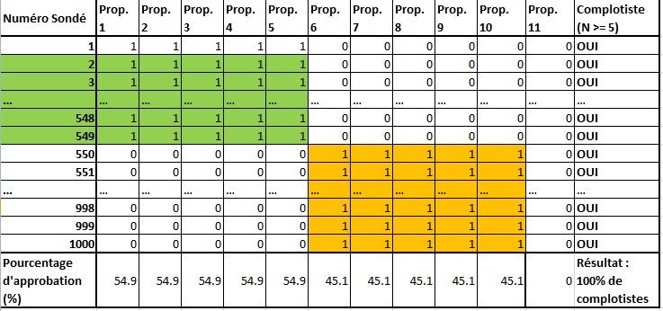le tableau que je te fournis est un contre-exemple à ton raisonnement qui fixait comme limite absolue au taux de complotiste dans l'échantillon le taux d'adhésion maximal à une proposition (55% en l'occurence), et ne prétend nullement reproduire les données de l'Ifop, ni même que les données qu'il contient soient probables. En tant que contre-exemple il n'est pas tenu pas de ces contraintes. Il n'est là que pour montrer une chose : le terme absolu ne peut pas être utilisé dans ton raisonnement.