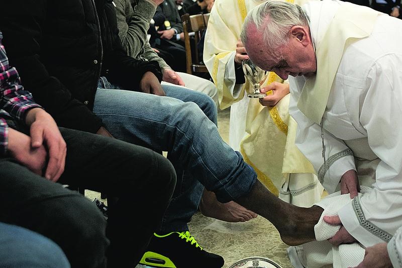 Photo fournie par les services de presse du Vatican montrant le pape François accomplissant le rituel du lavement des pieds au centre d'accueil pour migrants à Castelnuovo di Porto, près de Rome, le 24 mars 2016