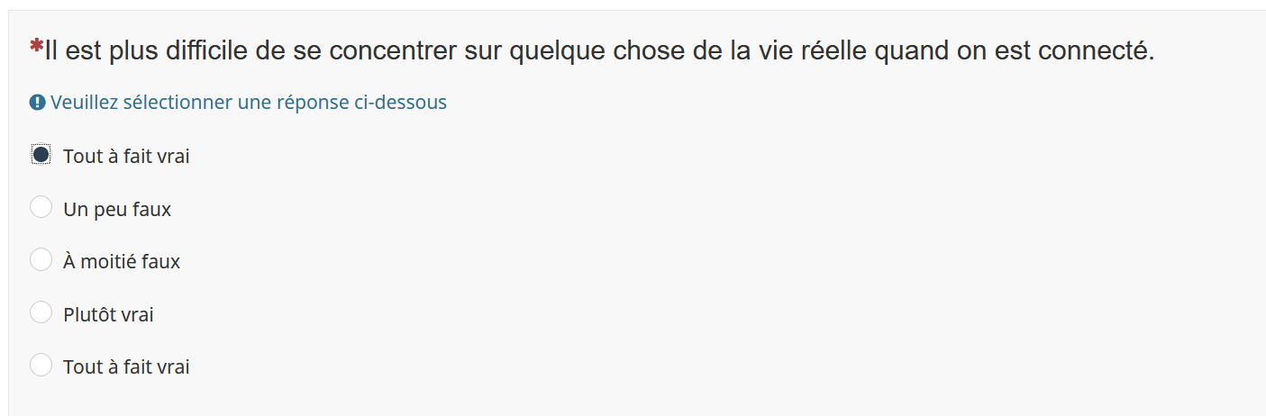 Ah bah alors si tu ne sais pas à quoi je fais référence, c’est que tu ne m’as pas bien lu, et que tu ne connais pas ce questionnaire. Si tu relis mon commentaire, je dis pourquoi j’ai été bloquée. Comment puis-je répondre à une question qui ne me concerne pas, autant j’ai répondu à la question d’internet et le travail, autant je suis dans l’impossibilité de répondre à celle d’internet  et des études, puisque je ne suis plus étudiante depuis longtemps,  je suis dans la vie active.