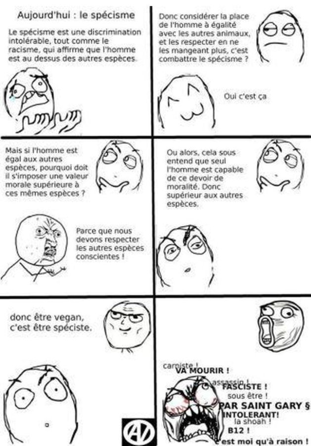 Le végan : - je suis antispéciste car je considère que le spécisme auquel tu contribues est mauvais. Et puisque tu es spéciste, comment soutiens-tu que le critère d’espèce soit pertinent pour décider de la manière dont on peut traiter un être sentient ? »